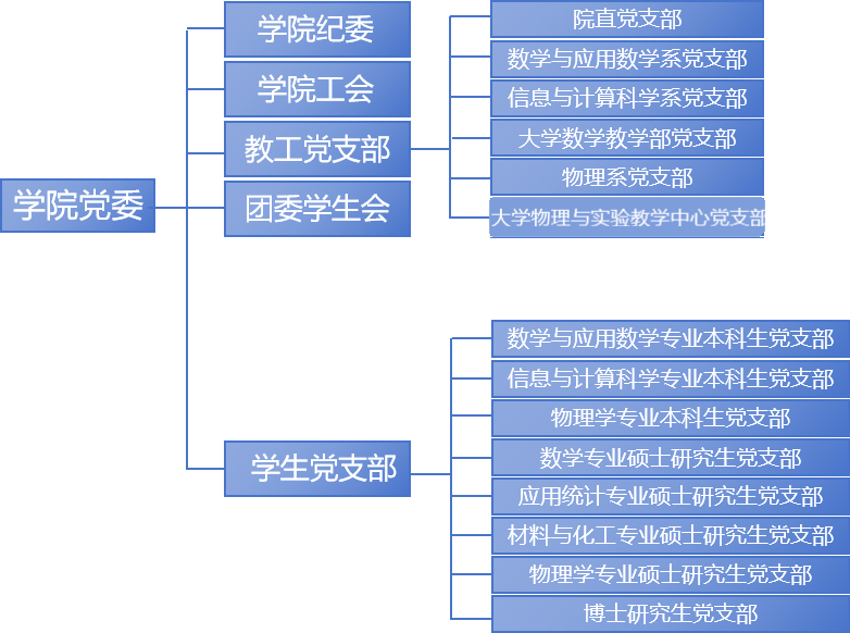 公司党委现设有党支部14个,其中教工党支部6个,员工党支部8个;现有党员332人,其中教工党员85人,员工党员247人,教师党支部书记“双带头人”达到100%,数学与应用数学专业本科生党支部获批公司第一批”样板支部“,已通过验收;物理实验中心党支部获批公司第二批”样板支部”,大学物理与实验中心党支部获批公司第二批“双带头人”教师党支部书记工作室。