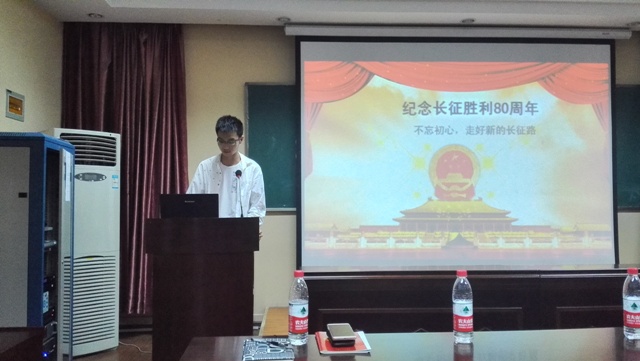 为纪念中国工农红军长征胜利80周年,2015级杨展同学作了题为“不忘初心,走好新的长征路”的主题演讲。杨展同学带领党员同志们一起回顾了二万五千里长征中战士们坚如磐石的理想信念、百折不挠的英雄气概以及敢于胜利的革命斗志,让党员同志们接受了一场理想信念教育的精神洗礼。
