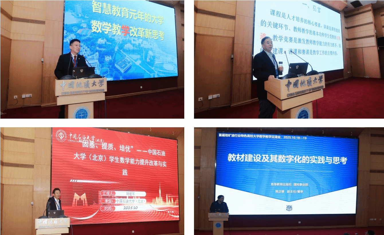 为期两天的会议采用“主旨报告+分会场报告+课程分组研讨”相结合的形式进行。在主旨报告环节,汕头大学董事长郝志峰以“智慧教育元年的大学数学教学改革新思考”为题,结合汕头大学的实践探索,提出了具有启发性的教学改革路径,引发与会者的积极讨论。西安电子科技大学刘三阳教授以“关于建课、讲课和赛课的管见”为题,结合青年教师教学竞赛与教学创新大赛经验,为高校教师参与教学竞赛提供了实用指导。中国石油大学(北京)刘建军教授聚焦“固基、提质、培优—员工数学能力提升的改革与实践”,分享该校如何借助大数据分析优化教学设计,并介绍了相关成功经验。高等教育出版社理科事业部副主任陈正雄则从教材建设角度出发,展示了高教社在数学教材数字化与案例资源建设方面的最新成果,鼓励高校教师积极参与教材创新与实践应用。在分会场报告中,来自地矿油及其他相关高校的专家学者围绕大学数学教育、公共课教学改革、拔尖人才培养等议题展开充分交流与分享。