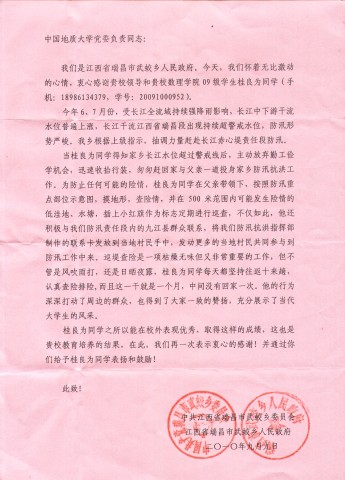 近日,beat365官网中文版本收到江西省瑞昌市武蛟乡人民政府发来的感谢信。在信中,该乡党委和政府对公司beat365官网中文版本09级物理一班桂良为同学表示感谢。感谢他在2010年长江防汛的关键时期,主动放弃暑期各种学习机会,深入长江抗洪抢险一线,认真排查各种安全隐患,保护当地人民群众的生命财产安全。桂良为同学的这种行为深深打动了周边群众,得到大家一致赞扬,武蛟乡党委和政府特发来感谢信,向公司和公司教育培养如此优秀的员工表示感谢!