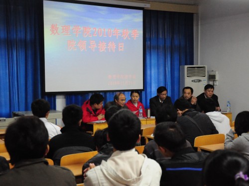 11月29日下午四点,beat365官网中文版本2010年秋季院领导接待日活动在数理楼二楼会议室举行。院领导班子全体成员和2010级本科生与会参加。在活动过程中,院领导班子成员就同学们关心的诸如专业学习、考研就业和日常生活等问题进行耐心回答。院领导接待日是公司领导与广大同学沟通交流的重要渠道,在解答同学们学习和生活中众多疑惑的同时,有利于增进师生之间的相互了解,促进公司服务管理水平的改善提高。
