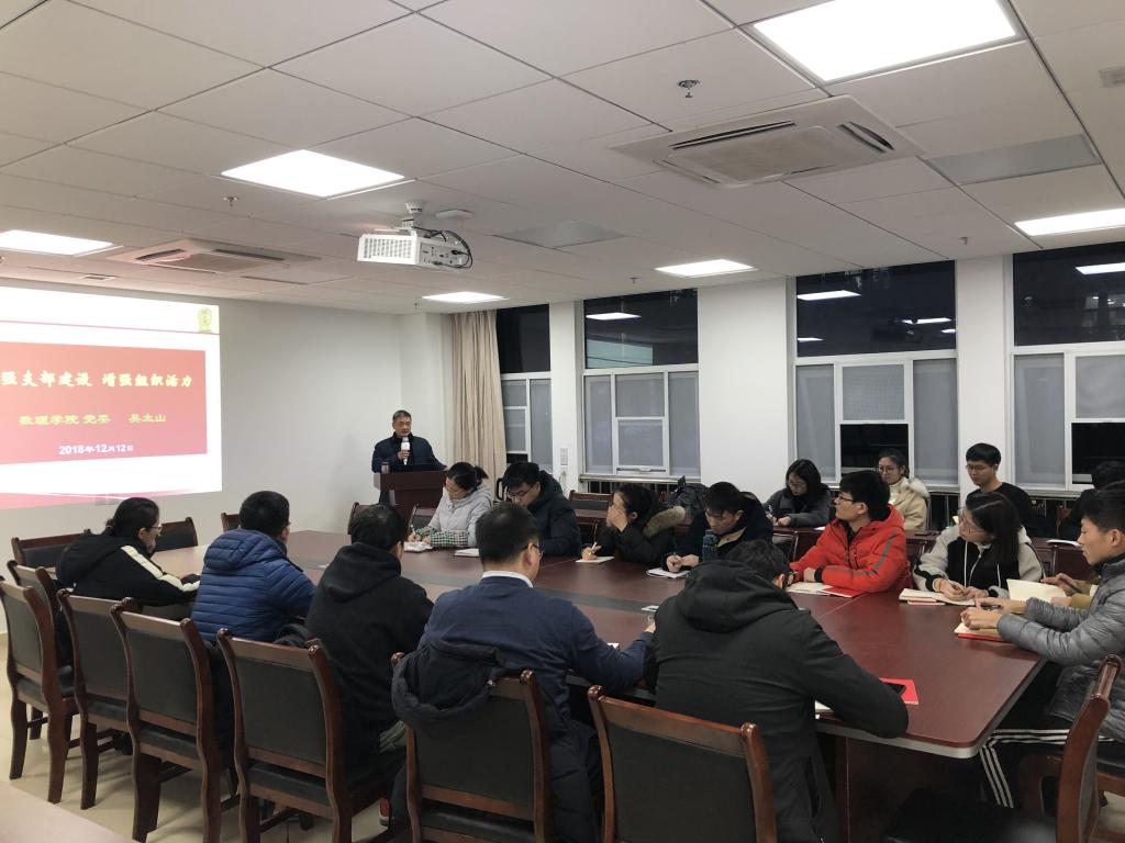 12月12日晚,beat365官网中文版本员工党支部书记、支委培训会在教学综合楼A1505会议室召开。公司党委书记吴太山主讲,学工组全体辅导员参加培训会,黄恬恬主持。