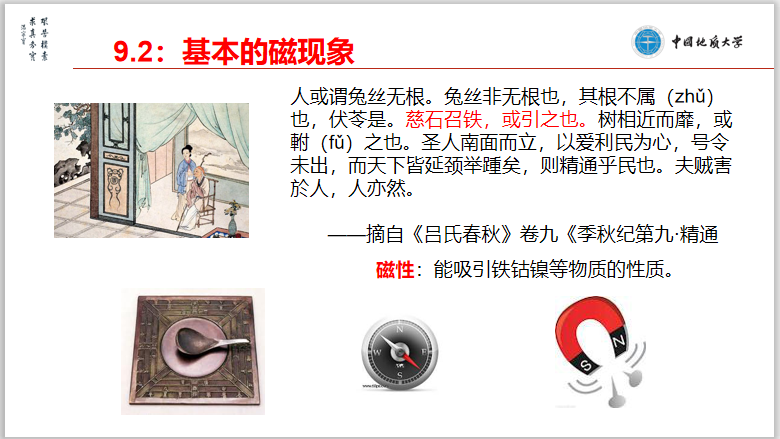 结合线上教学对时空限制的弱化,在编排教学内容时,大学物理云教学团队结合教学内容实际和疫情期间所涌现出的可歌可泣的英雄事迹为载体对员工进行德育教育,培养同学们在艰难的时期保持一种昂扬的斗志和“越艰险越向前”的无畏精神和勇气,敢于求真、求善和求美,如图1。例如,在讲到牛顿运动定律和狭义相对论时,结合当时牛顿和爱因斯坦分别所处的环境,培养同学们在抗击疫情期间,不畏艰险,不忘对知识的渴望,对真理的孜孜追求以及敢于质疑和挑战的勇气;在讲到守恒律与对称性时,教导和培养员工“美美与共,天下大同,既要各美其美,也要美人之美”的欣赏和发现美的品质;在讲到铁磁现象时,引用我国优秀传统文化《吕氏春秋》中对磁现象的阐述(如图2),同时结合疫情期间中国神州大地所充满的“人间大爱”为载体,培养同学们“利民爱民”之品质,培养同学们“小爱之心存善念,乐于奉献;大爱之勇于担当的家国情怀。”