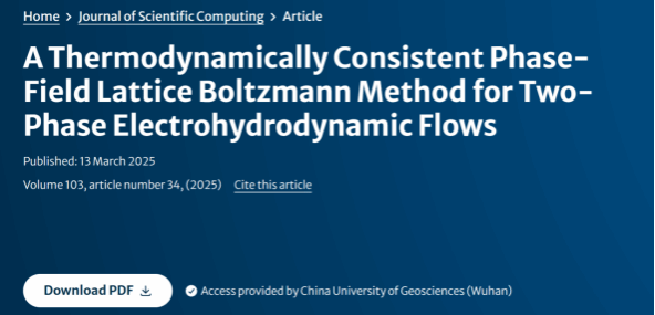 近日,我院2023级硕士研究生熊芳以第一作者身份在计算数学领域国际知名期刊《Jounal of Scientific Computing》上发表了题为”A thermodynamically consistent phase-field lattice Boltzmann method for two-phase electrohydrodynamic flows”的研究论文。该论文由beat365官网中文版本为第一通讯单位,汪垒副教授为论文的通讯作者,该论文得到了国家自然科学基金面上项目(NO.12472297)的资助。