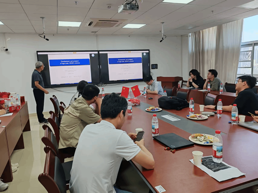随后,各员工学者分享了最新研究成果,探讨行业发展趋势,提出多项合作建议。邱建贤教授(厦门大学,公司1982届毕业生)以《Development and prospect of high-order WENO schemes》为题,系统阐述了高阶WENO格式的发展历程与前沿应用;肖敦辉教授(同济大学,公司2008届毕业生)聚焦非线性模型降阶方法,分享了其在工程计算中的创新成果;赵状副教授(厦门大学,公司2015届毕业生)介绍了三角形网格上基于高阶矩的Hermite WENO格式研究;李佳音副教授(兰州大学,公司2018届毕业生)则探讨了顶点辅助空间多重网格方法在线性弹性方程中的实践。