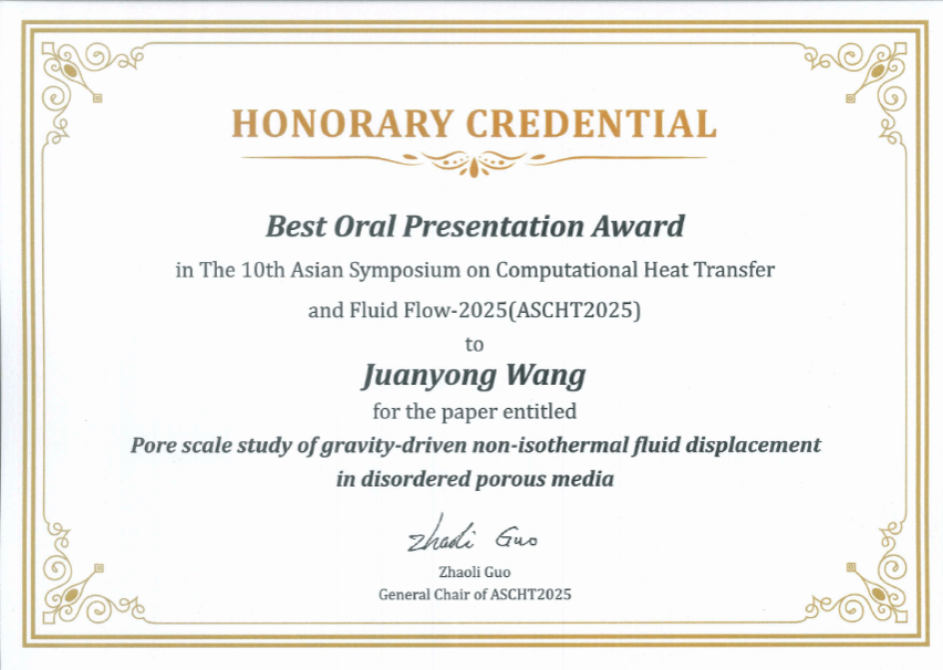 公司2025级博士研究生王隽永凭借其出色的研究工作和现场报告脱颖而出,荣获大会“最佳口头报告奖”(Best Oral Presentation Award)。王隽永同学的获奖报告题目为《Pore scale study of gravity-driven non-isothermal fluid displacement in disordered porous media》。该研究聚焦于蒸汽辅助重力泄油(SAGD)等强化采油技术中的关键物理过程,利用格子玻尔兹曼方法进行高精度的孔隙尺度数值模拟,系统揭示了在复杂的地下油藏环境中,孔隙结构的非均匀性、孔壁的润湿性以及固液相间的共轭传热如何共同影响多相流体的驱替模式和相变动力学。研究观察并阐释了均匀孔隙结构中的“聚并式”Haines跃迁现象,并探究了两种不同的界面运移模式:“蒸发-扩散侵入”与“快速侵入” 。这些成果对于优化非均质油藏的蒸汽注入策略、提高采收率具有理论指导价值和工程应用前景。