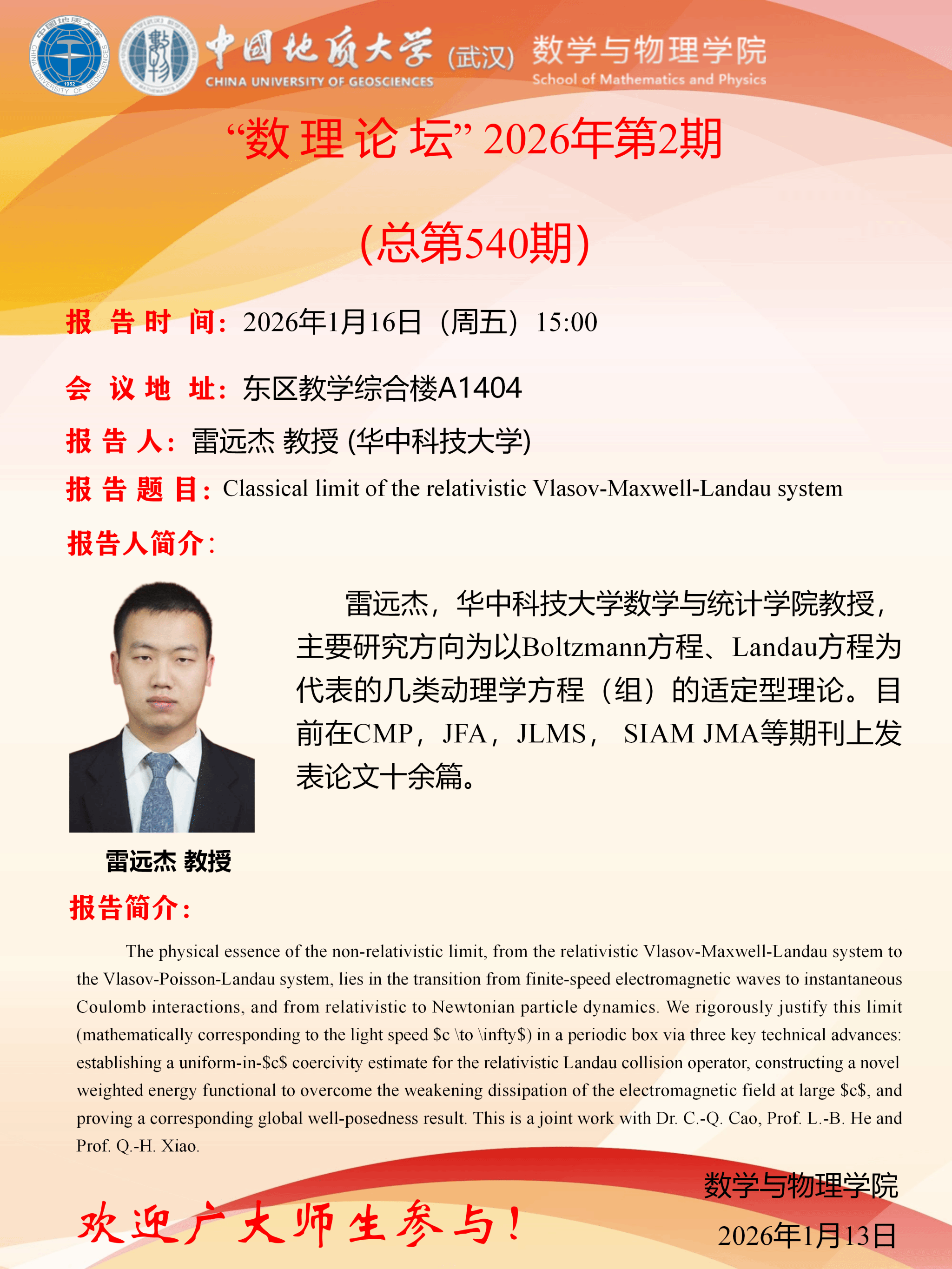 2026年1月16日雷远杰教授学术讲座: AClassical limit of the relativistic Vlasov-Maxwell-Landau system