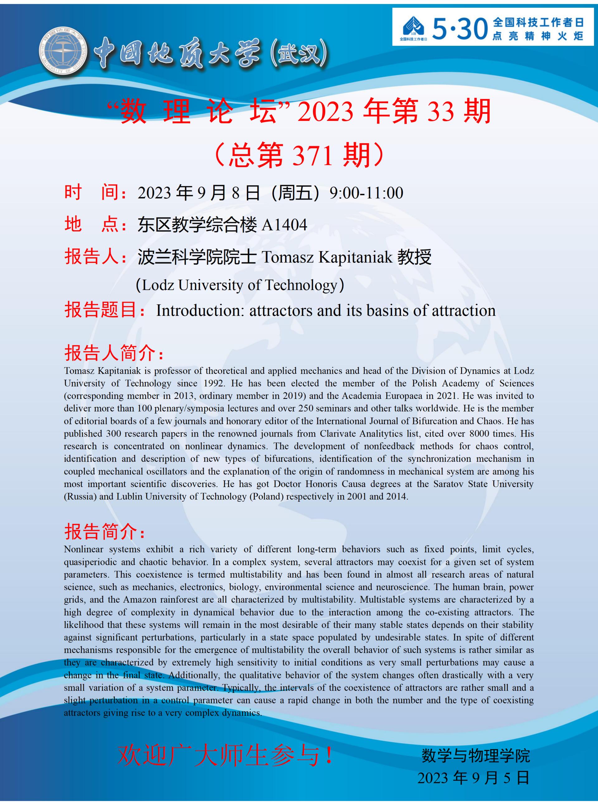 2023年9月8日Tomasz Kapitaniak院士学术讲座:Introduction: attractors and its basins of attraction