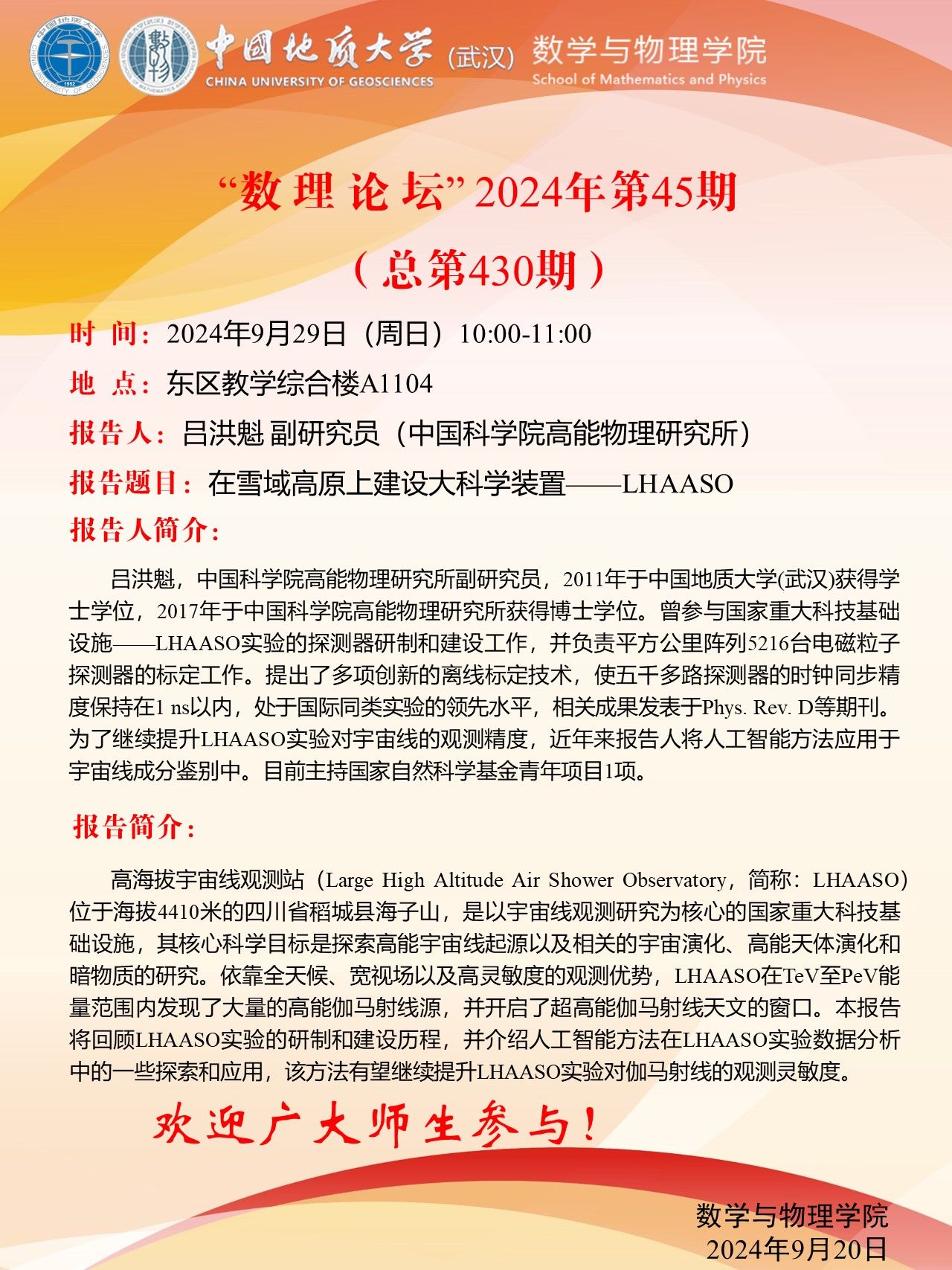 2024年9月29日吕洪魁副研究员学术讲座:在雪域高原上建设大科学装置——LHAASO