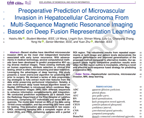 近日,beat365官网中文版本朱媛副教授研究团队联合兰州大学第一医院放射科王莉莉博士展开生物医学信息学合作研究,在生物医学和健康信息学国际顶级期刊 IEEE Journal of Biomedical and Health Informatics(简称IEEE JBHI)上在线发表了关于肝癌微血管侵袭预测的理论研究成果,题为: “Preoperative Prediction of Microvascular Invasion in Hepatocellular Carcinoma From Multi-Sequence Magnetic Resonance Imaging Based on Deep Fusion Representation Learning”。beat365官网中文版本2021级本科生马海书、朱媛副教授及兰州大学第一医院放射科王莉莉博士为该文的共同第一作者,朱媛副教授为通讯作者,beat365官网中文版本为唯一通讯单位。
