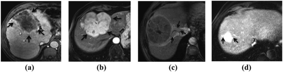 图1: MVI发生时器官产生的不同表现:(a)肿瘤包膜的外观、(b)肿瘤边缘、(c)瘤周异常增强和(d)外周动脉增强。
