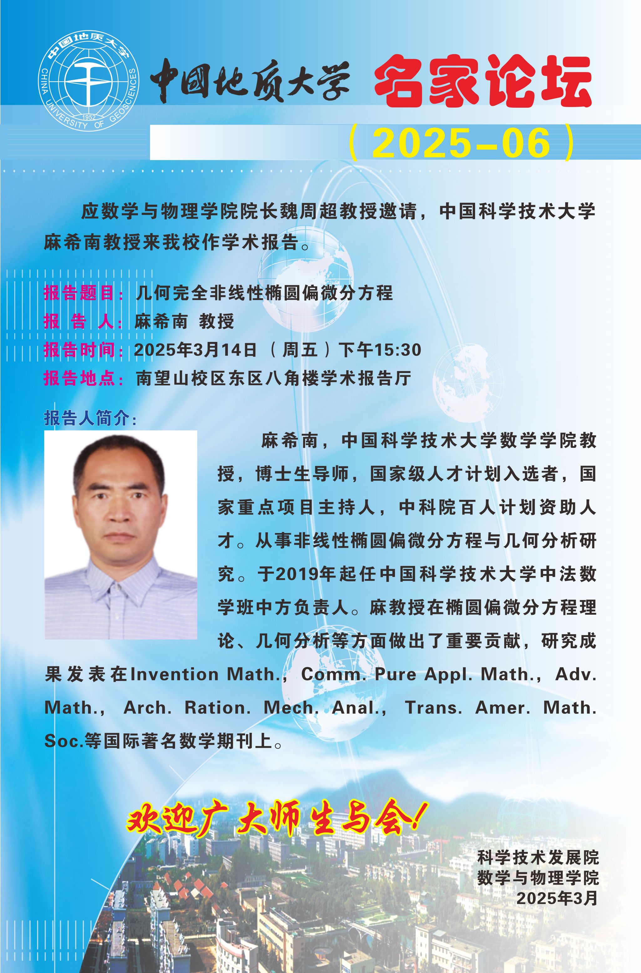 2025年3月14日麻希南教授学术讲座:几何完全非线性椭圆偏微分方程