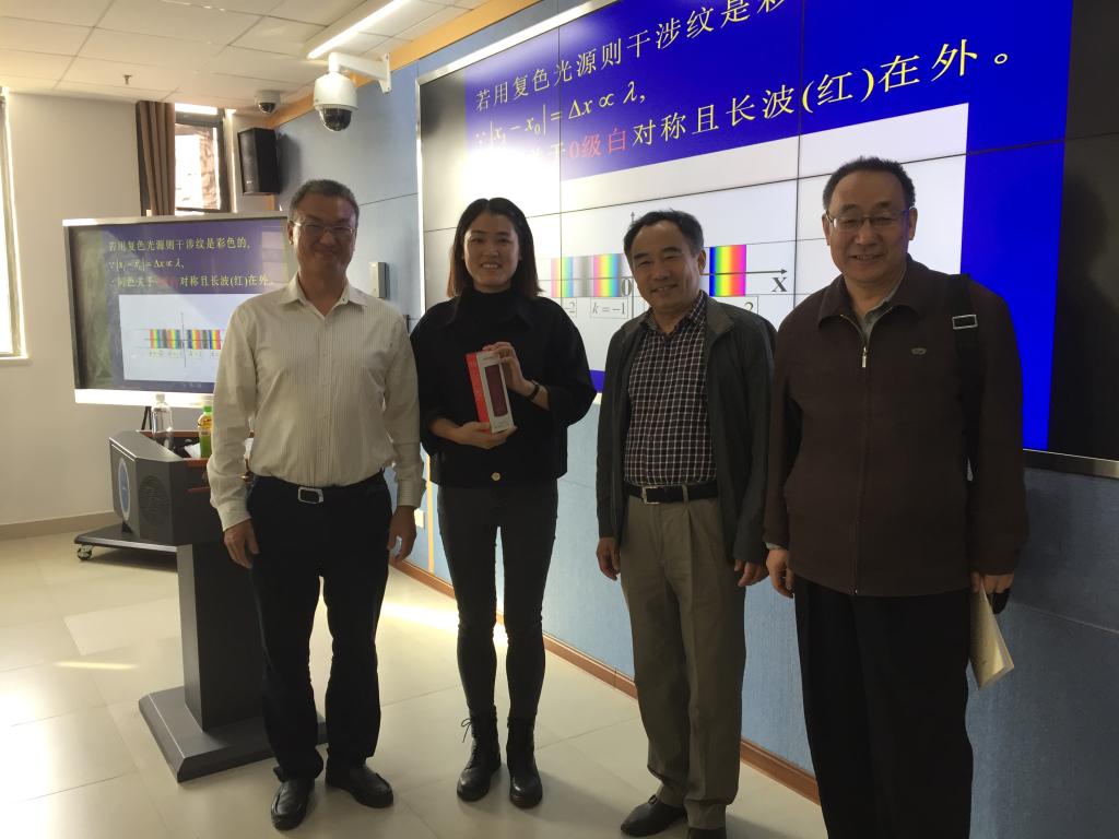 10月24日上午,公司领导吴太山、郭上江、张光勇、程永进等一行7人前往未来城校区,看望当天在新校区上课的李铁平、汤型正、黄刚、丁思静、谢宜龙等老师,给每一位在新校区上课的老师赠送1个保温杯。院领导还实地考察刚刚投入启用的公教2楼的每个大学物理实验室,检查了其中将用作老师们辅导答疑、批改作业、课间休息的117室的设施配置情况,商请物理实验中心为每位老师设置二维码钥匙,扫描二维码即可开门。院领导现场还决定配置10个公用小拖车,方便老师携带作业本。