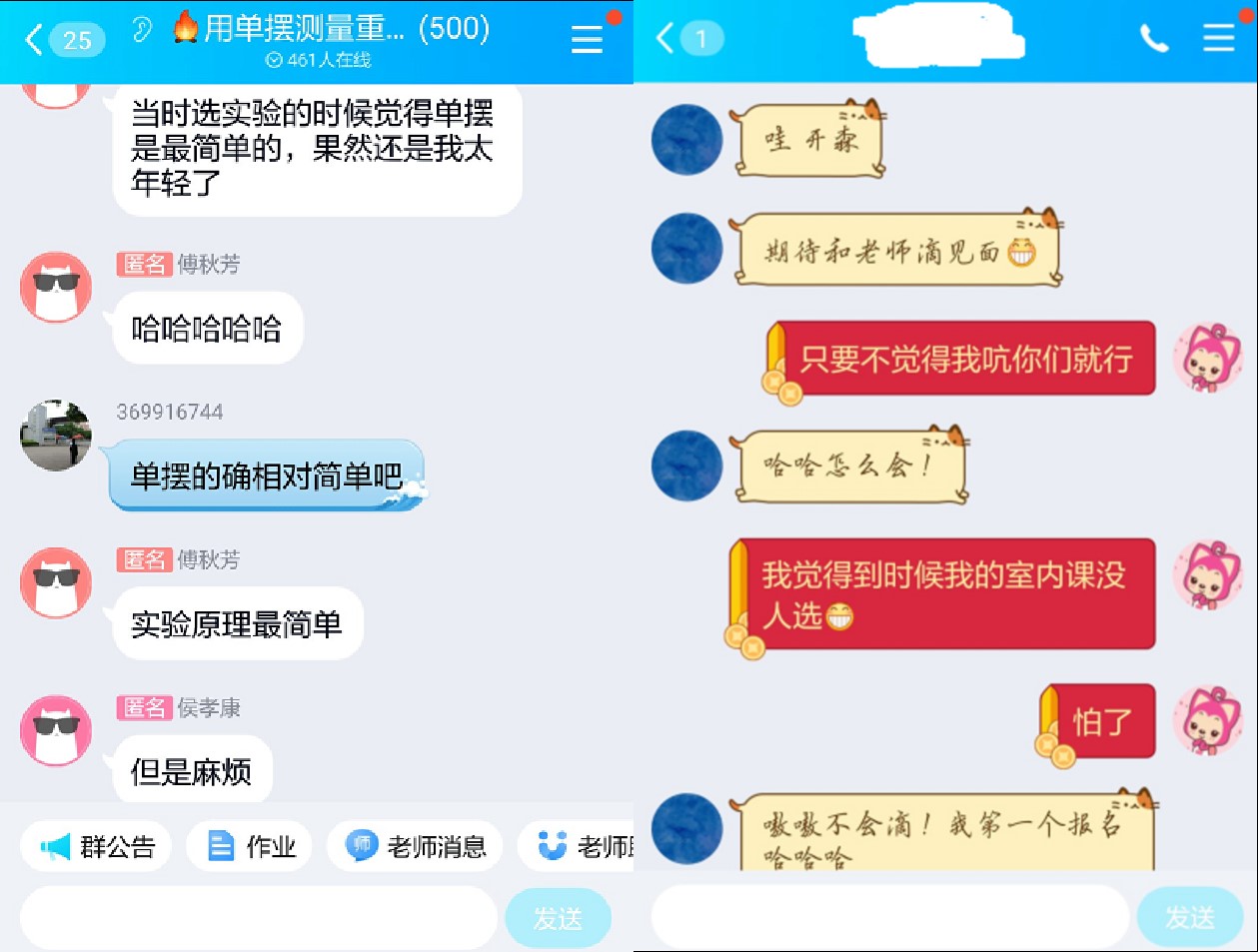 在实际操作过程中,并没有因为虚拟实验,降低了标准和质量。如金三梅老师的“用单摆测量重力加速度”实验,实验名字听起来简单,因此选的人非常多,以至于首次选择该实验的员工非常多,两个500人的QQ群仍然不够容纳所有员工。但员工做完这个看似简单的实验后,在实验指导群中匿名留言:“金老师对实验数据的要求很高,这个实验不好混呐”。当然,在严格要求下,同学们也学会了实验数据的处理,不确定度的计算等,培养了对待科学的严谨态度。