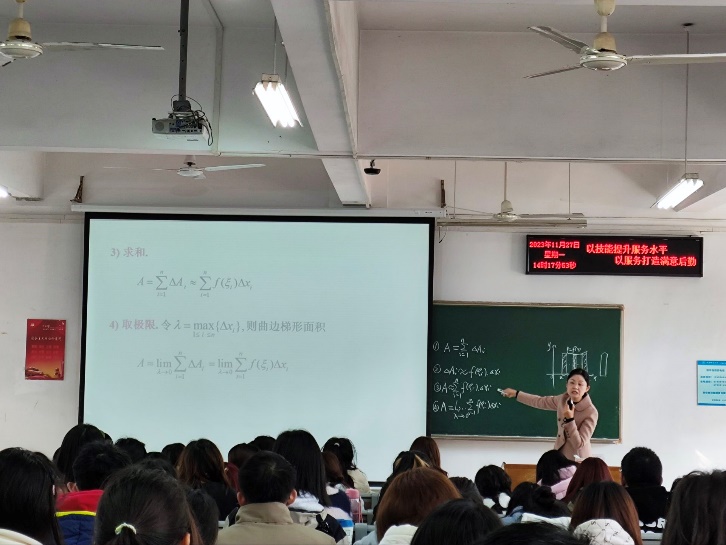 2023 年 11 月 27 日,在大学数学教学部组织下,大学数学教学部多名教师在北综楼101现场观摩了陈兴荣老师的“高等数学”公开课。陈老师将多媒体与板书完美结合,授课手段使用合理有效。授课中,陈老师通过精心设计例题,丝丝入扣,教学环节衔接自然,语言准确,讲解清晰明了,将枯燥的概念讲得深入浅出,通俗易懂,启发式教学引导员工思考、分析问题,积极参与教学活动,课堂师生互动充分,整个课程气氛活跃,达到了很好的教学效果,陈老师的授课得到了观摩教师们的一致好评。