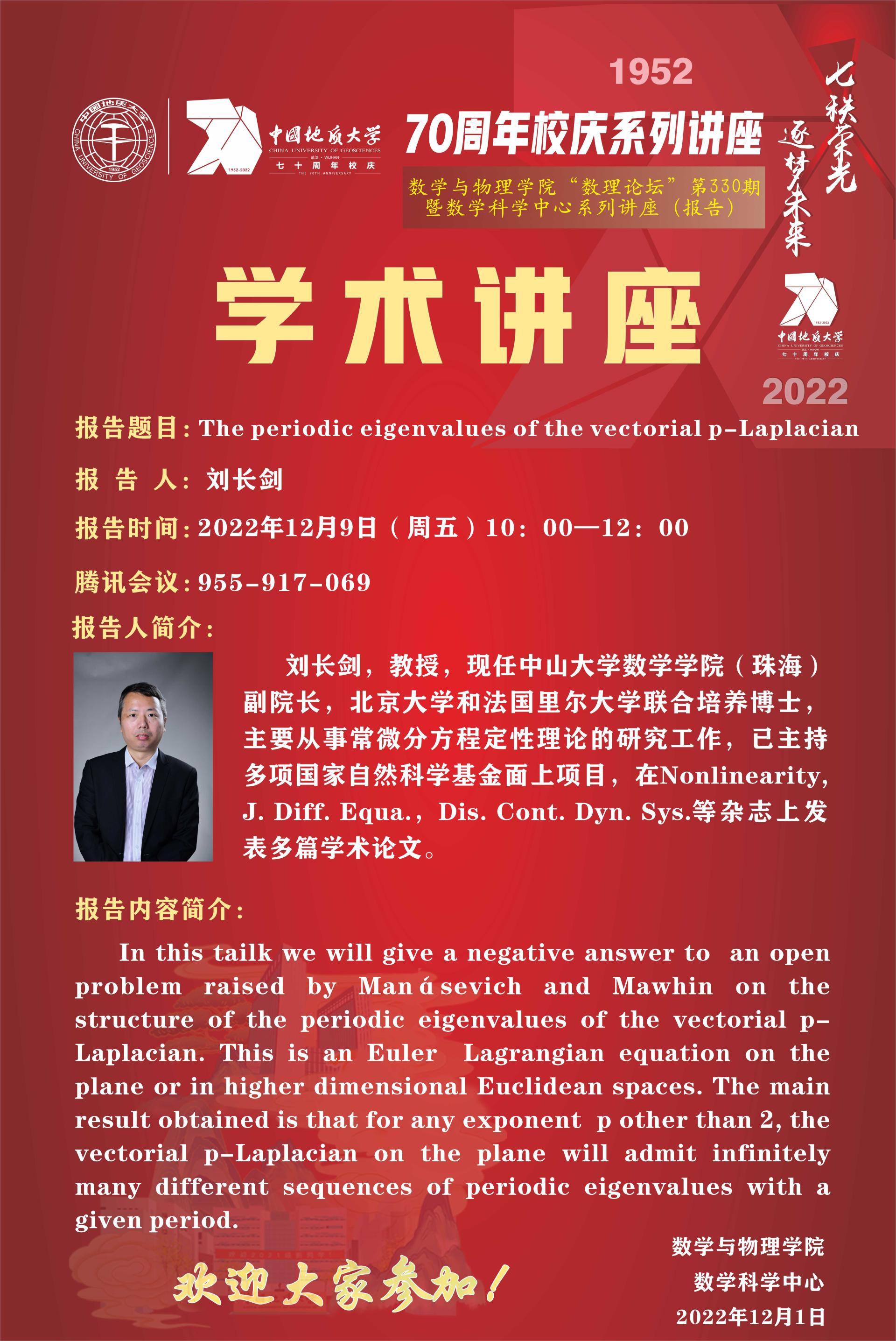 "数理论坛"第330期暨数学科学中心系列讲座(报告):The periodic eigenvalues of the vectorial p-Laplacian